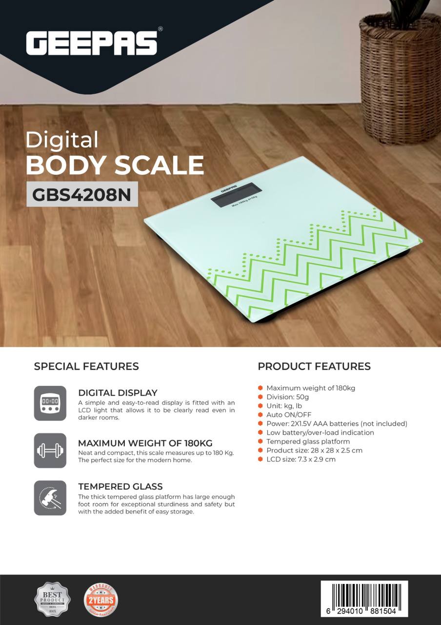 - ترازو دیجیتال جیپاس GBS4208N با حداکثر وزن 180 کیلوگرم و دقت بالا مناسب برای استفاده در منزل است.