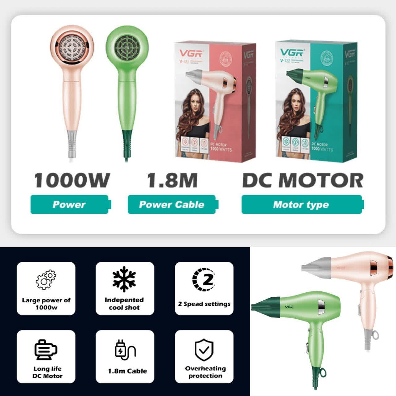 سشوار وی جی آر مدل V-432 یک سشوار مسافرتی جمع و جور و قابل حمل با توان 1000 وات است. این سشوار دارای موتور DC پرقدرت، 2 حالت تنظیم دما و 2 حالت تنظیم سرعت است. همچنین دارای یک سری متمرکز کننده هوا برای خشک کردن سریع موها و یک دکمه خنک کننده توربو برای تنظیم دمای هوا در حالت خنک است.